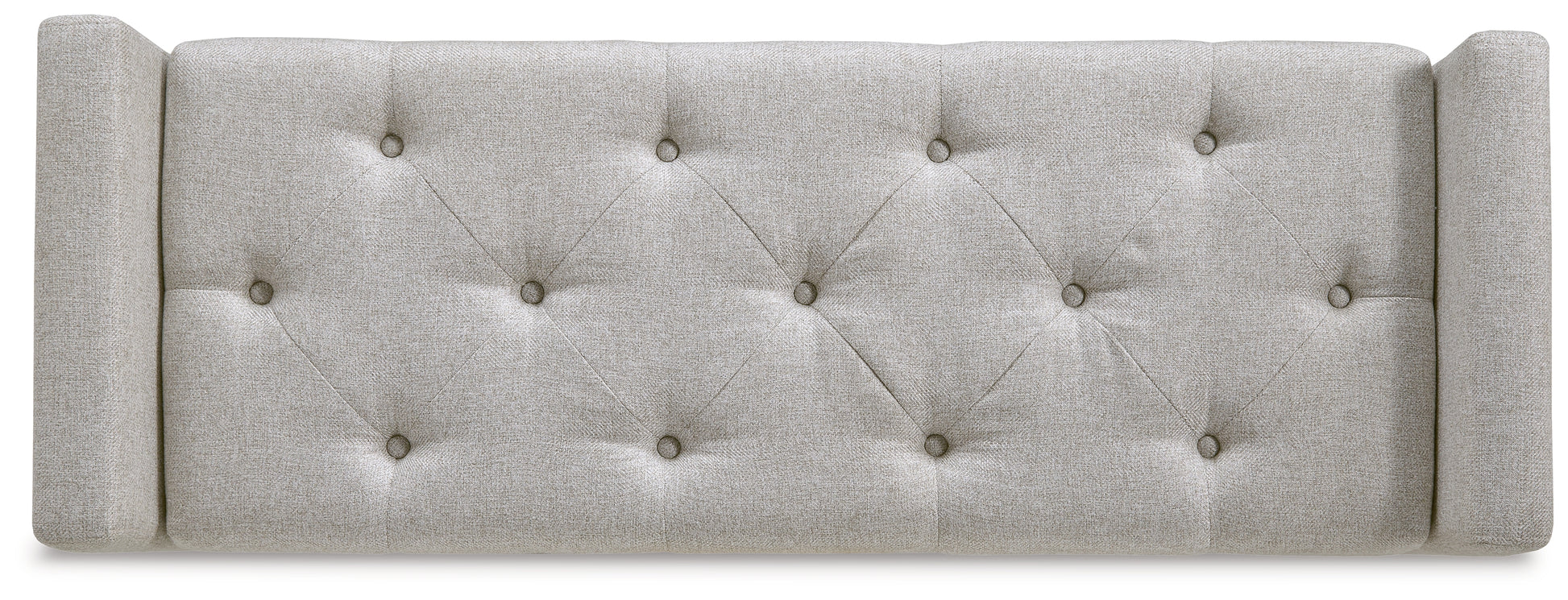 Contemporary style gets practical with this bench. The tufted beige seat cushion is hinged to allow easy access to whatever you need to hide in plain sight. The raised edges give the impression of arms on this cushioned seat while the light brown finished wood legs help it blend with many different modern styles.