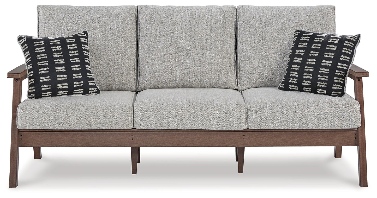 Get back to nature with the relaxed styling of this outdoor sofa with cushions. Crafted of MEGA-TUFF® HDPE material, it combines the exceptional durability and weather resistance you need with the “wood look” you love. Rest assured, the cushions are wrapped in comfortable and carefree Nuvella® fabric, leaving you plenty of time to sit back and smell the roses.