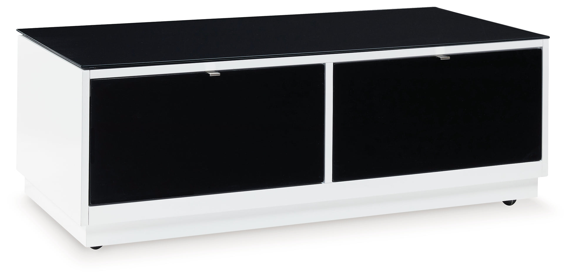 Combining a high-gloss white finish with a black glass tabletop, this coffee table proves opposites really do attract. It's the perfect blend of modern style and functionality, with two roomy drawers for storing essentials and a large open display shelf for decorative items. Want to rearrange the furniture? Casters make it easy to adapt to any situation.