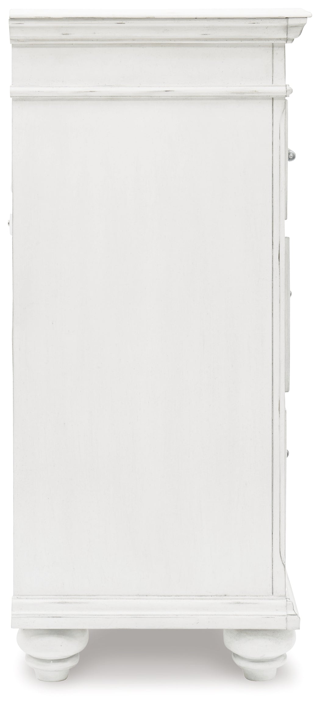 Give your retreat vintage charm and valuable drawer storage with this dresser and mirror set. In a beautifully distressed whitewash finish, you'll love putting it all away in casual style. Seven full-sized drawers and two accessory top drawers will easily accommodate your needs. Its beveled mirror brings magnificent height to this piece. Generously scaled moulding from top to bottom, along with bun feet and drawer handles with a transitional aesthetic, give this dresser and mirror character—evoking the feel of a quaint cottage escape.