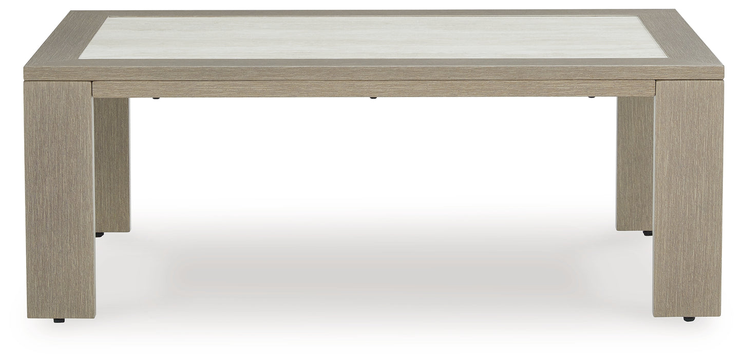 This outdoor coffee table is just what you need to get your outdoor party started. Though it looks remarkably like wood, its durable frame is perfectly suited for alfresco living. A striking tabletop with the look of natural stone serves up plenty of room for snacks and drinks.