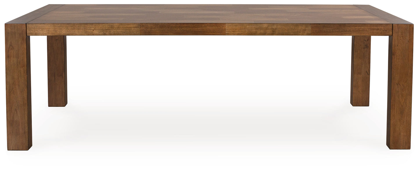 Experience worry-free living with this dining table. Designed to effortlessly blend casual and refined aesthetics, the rich brown butcher block veneer exudes a modern, relaxed vibe you'll love. Styled to comfortably seat eight, this piece makes room for one and all.