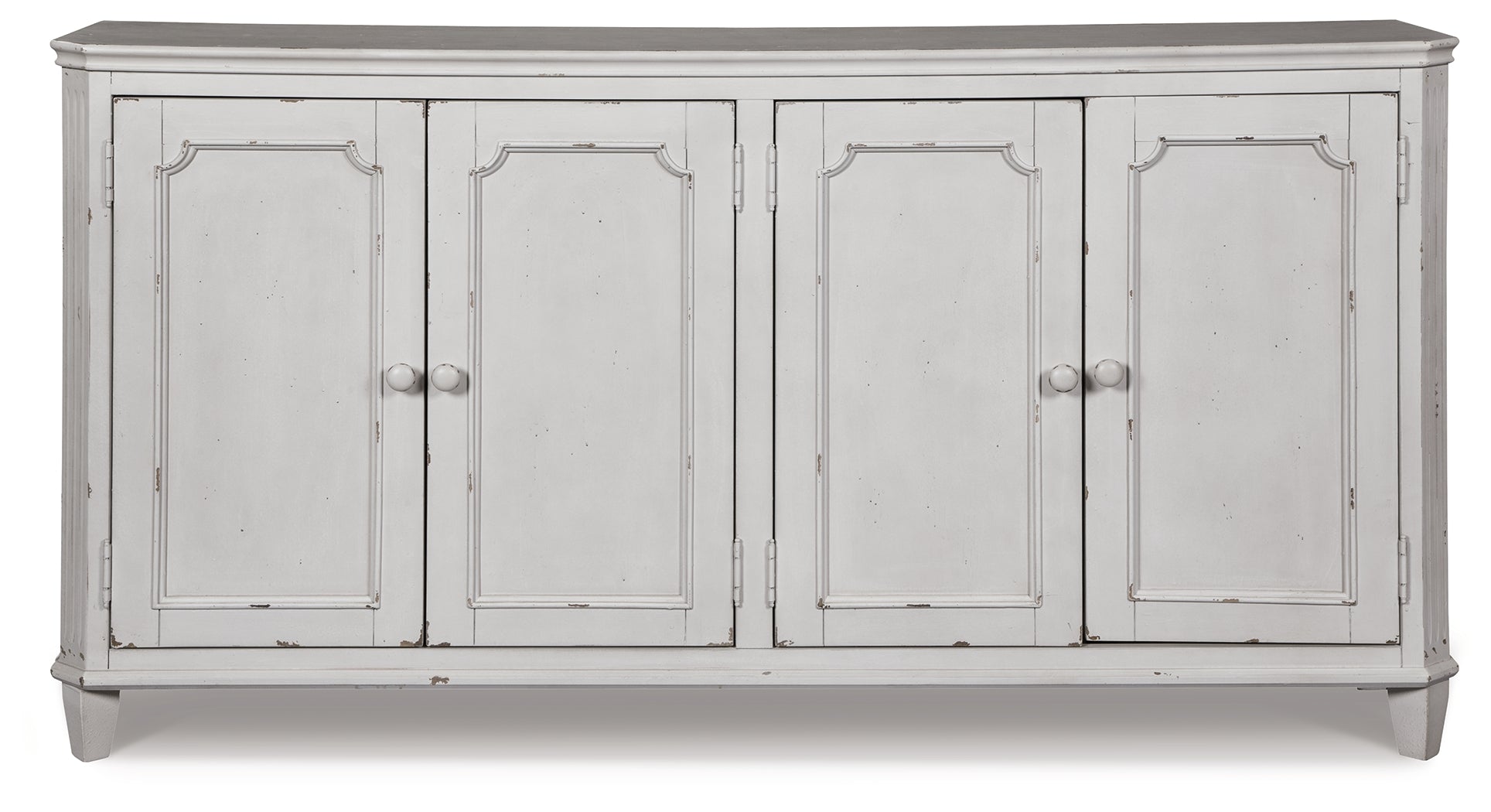 With its distressed vintage paint finish, fluted details and French provincial mouldings, this exquisite cabinet is sure to grace your space in such a très chic way. Adjustable shelved storage is abundantly practical, be it in a dining room, living room or entryway.