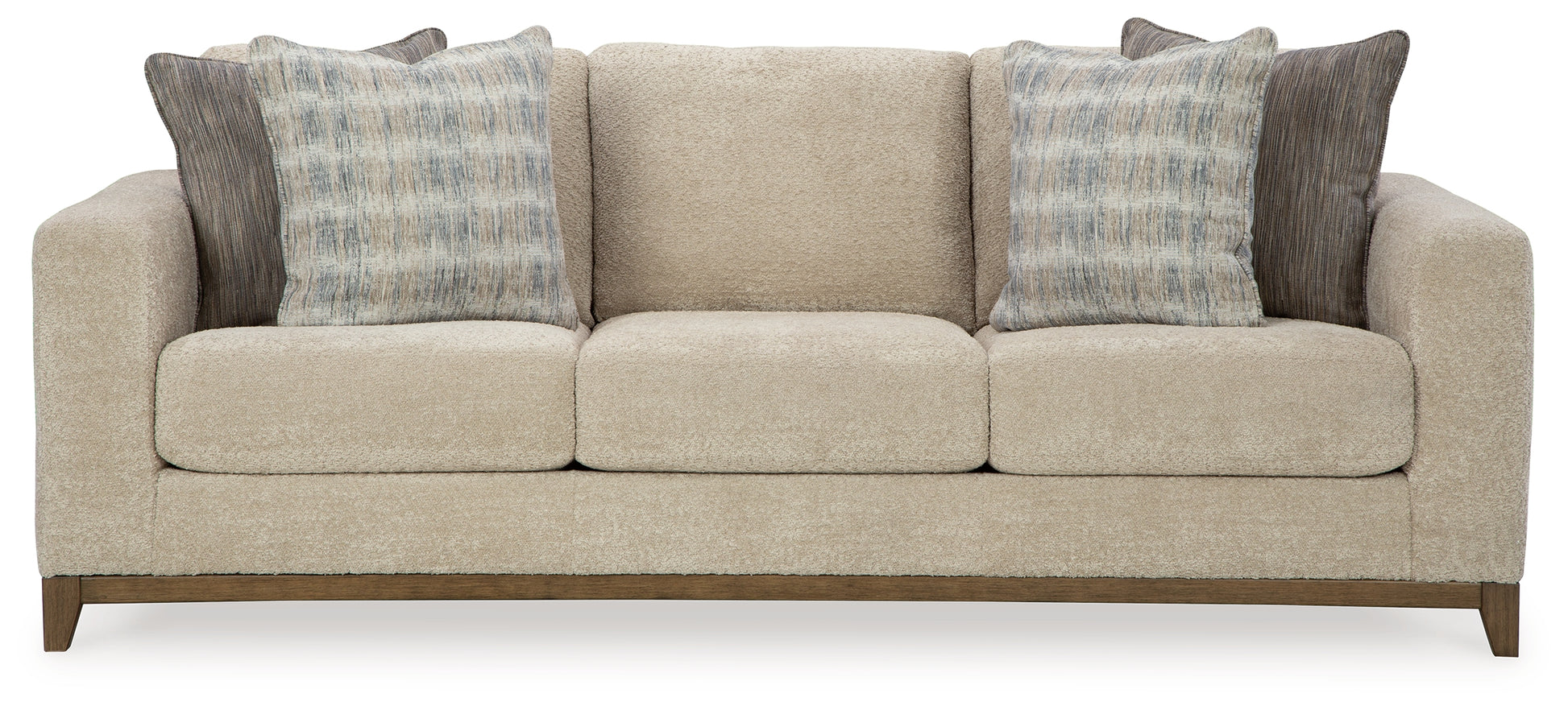 Serene style with a modern sensibility. Delight in the cozy, versatile embrace of this oversized chair. It takes an on-trend approach to irresistible texture and natural beauty, showcasing soft upholstery accented with a transitional wood trim. As refined as it is laid back, the chair also keeps comfort a priority with a plush, thick seat cushion.