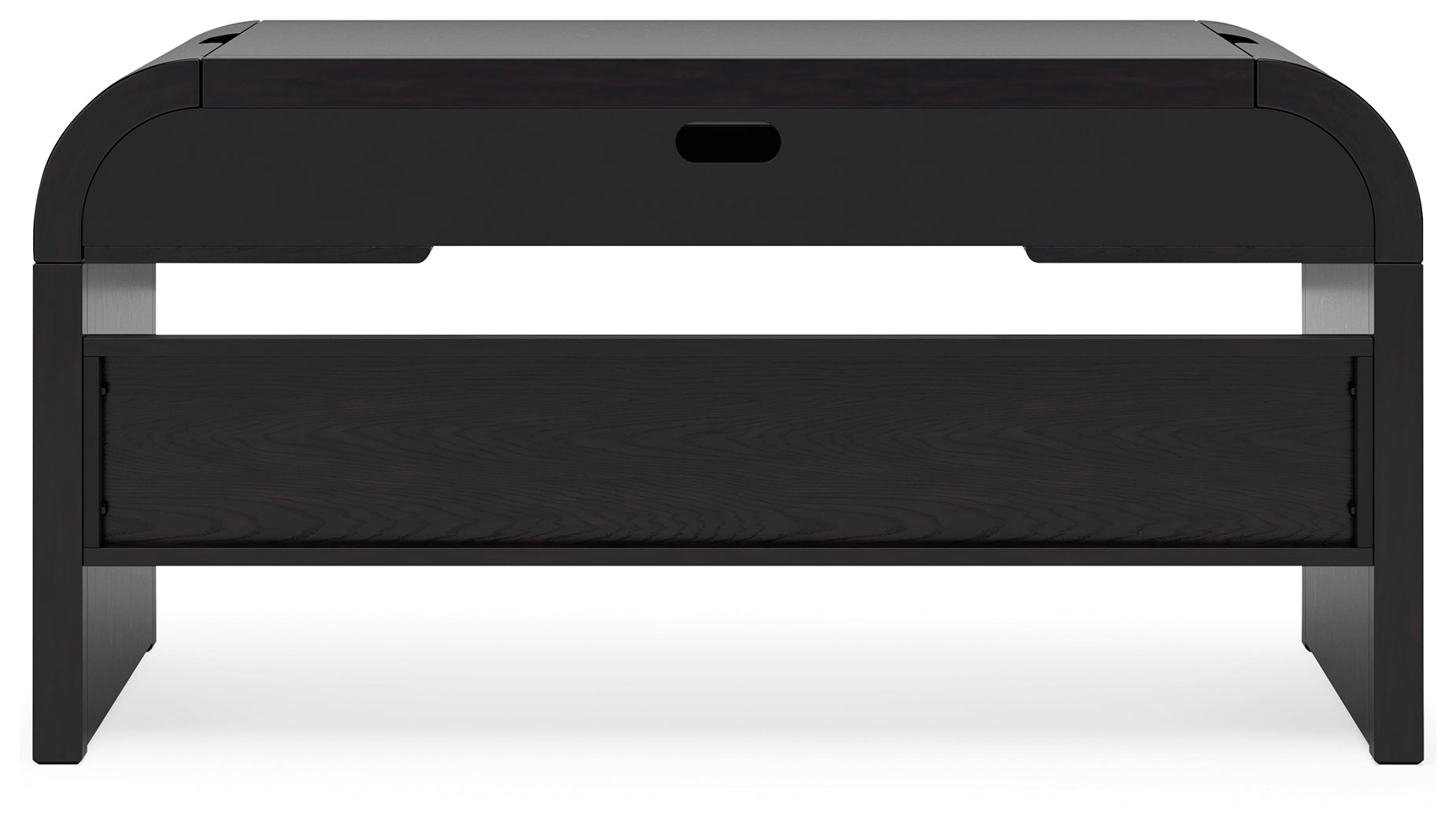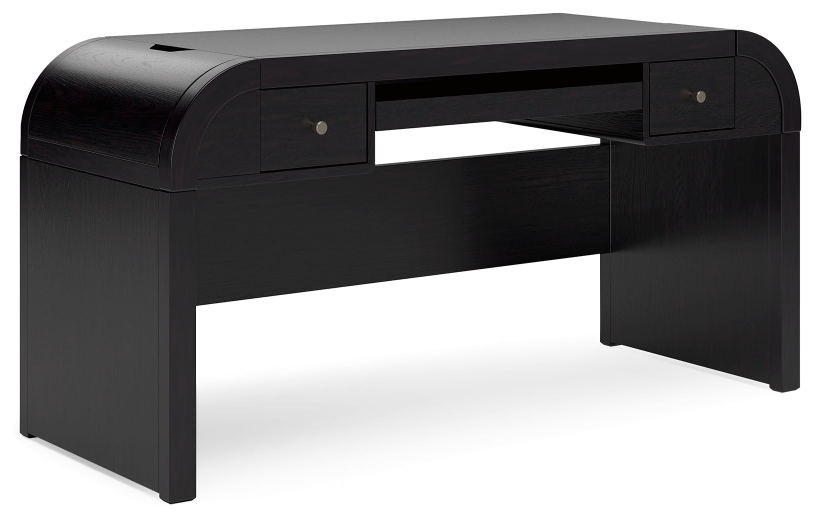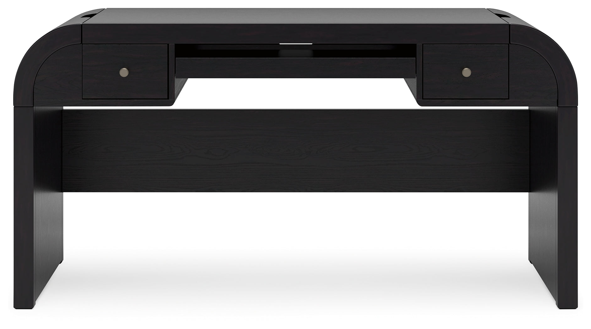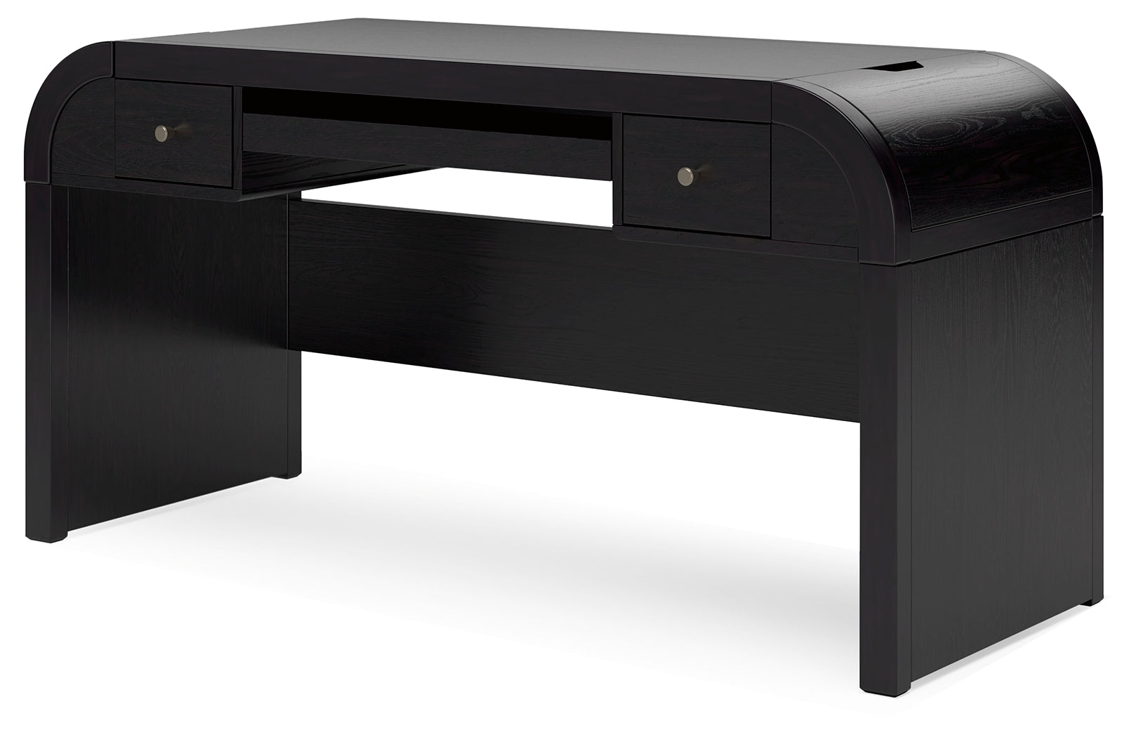Inspired by art deco design, this softly shaped home office desk makes a lasting impression in a simply stunning way. Its magnificent curved silhouette is enhanced by a rich layered black finish on the textured wood grain surface. Complete with ample storage, a pull-out keyboard tray and USB charging, this is the all-in-one piece you’ve been looking for to elevate your contemporary workspace decor.