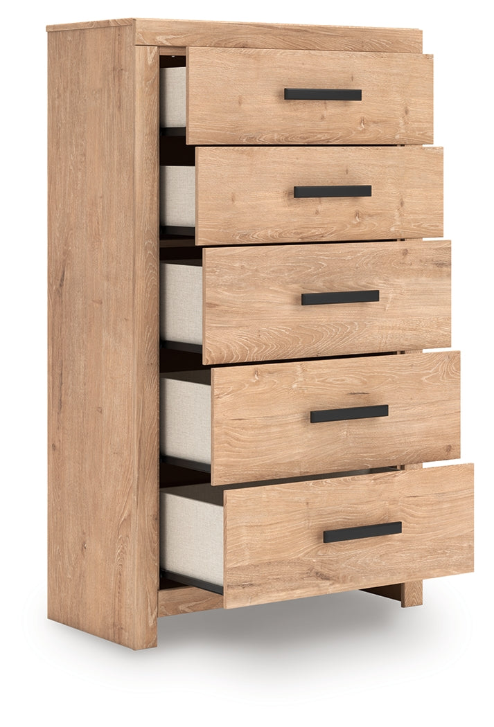 This dresser with mirror brings a touch of modern farmhouse charm to your home. Its light oak finish and clean lines have a fresh, airy feel, effortlessly creating an inviting atmosphere for a restful night’s sleep. Six spacious drawers with large black handles provide plenty of storage for all your nighttime essentials.