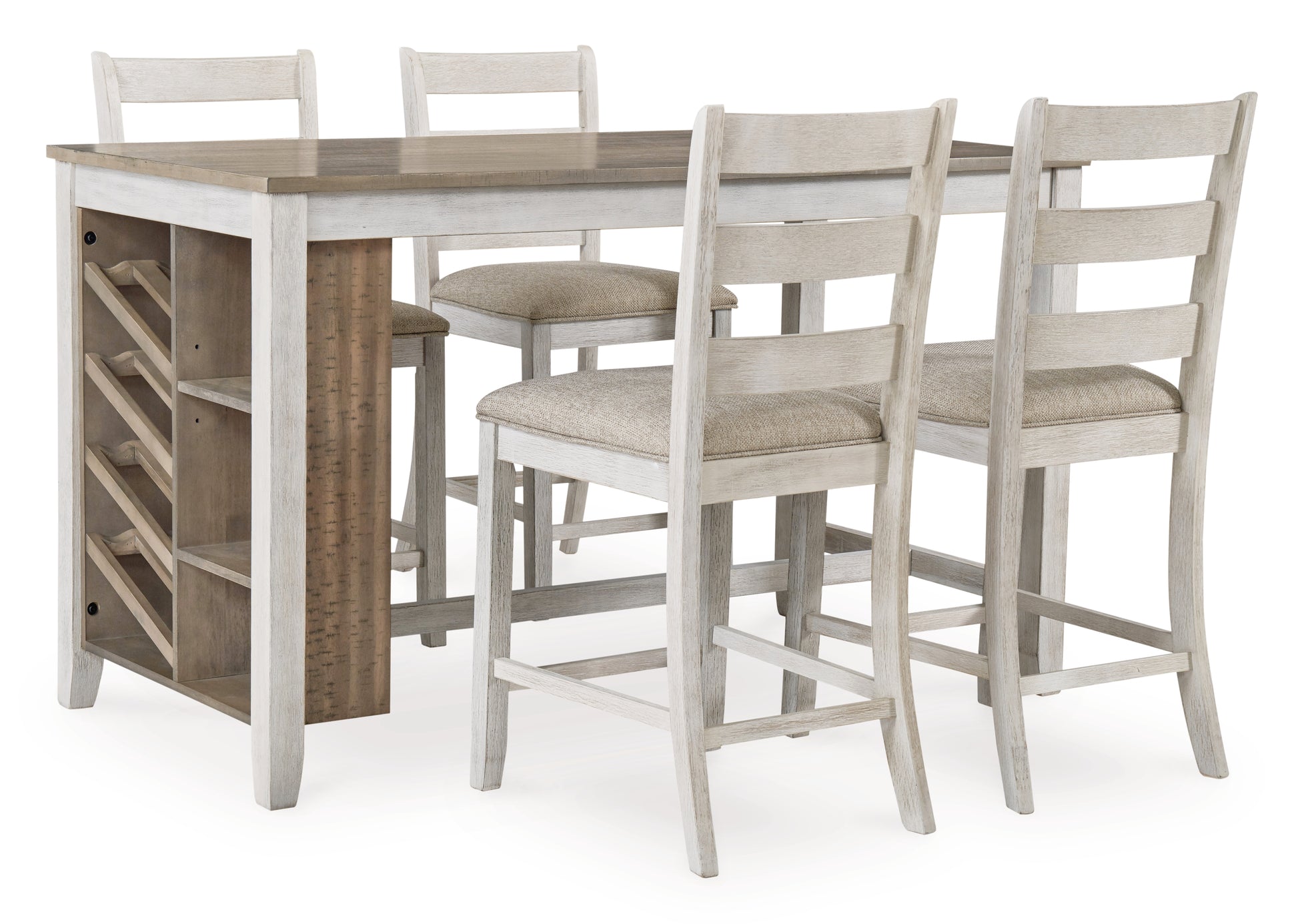 Set the scene for coastal chic or modern farmhouse living with this counter height dining set. The clean-lined, simply striking table doubles the charm with a brown plank effect top, paired with a grayish white base with a rub through effect for timeworn appeal. Six bar stools with classic ladderback styling and comfortably upholstered seats make room for one and all.