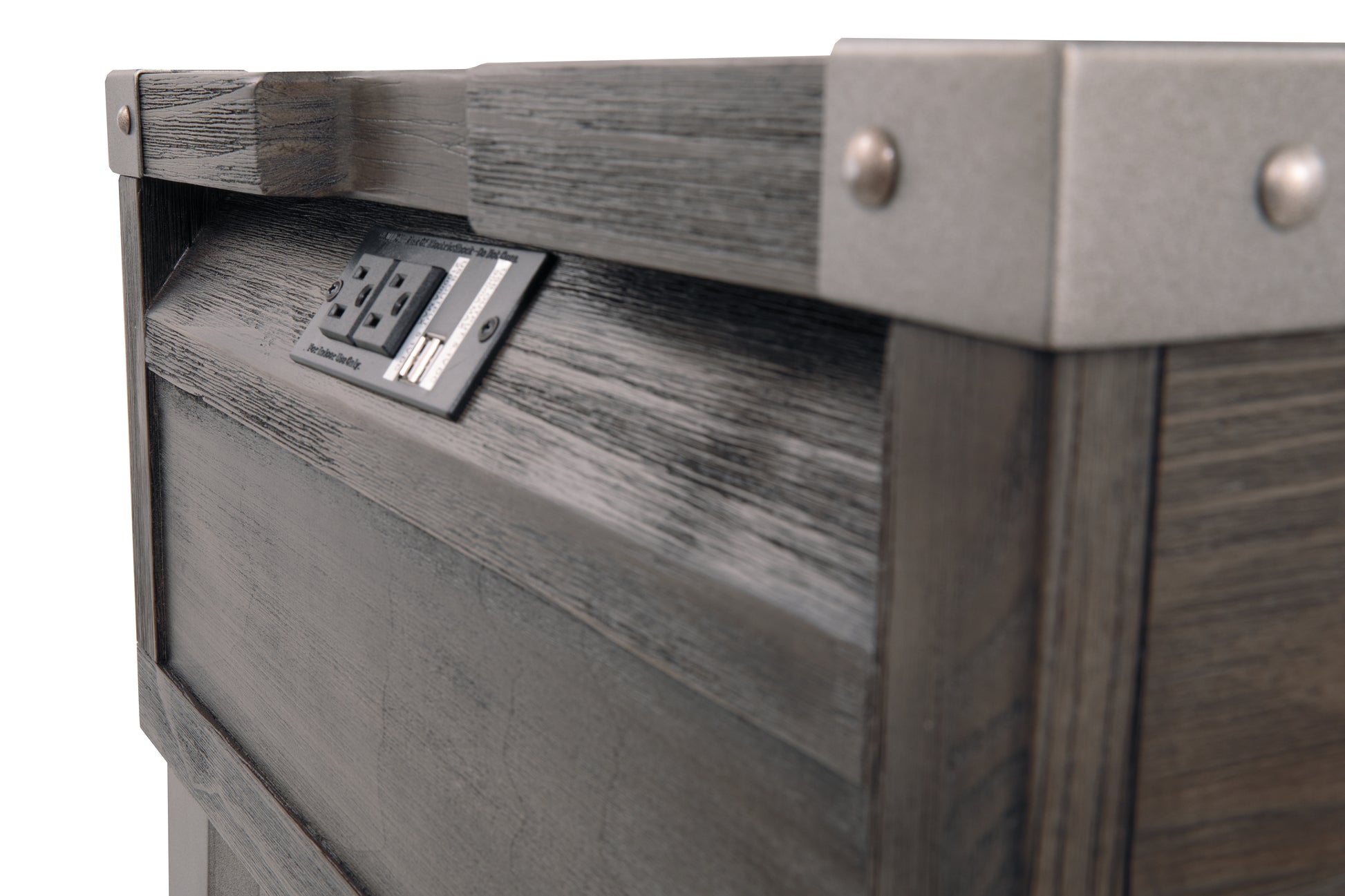 Take a stance for rustic-industrial style with this mixed material end table. Weather-washed pine wood and veneers are contrasted with canted metal legs and corner bracket accents for a uniquely chic merger of earthy beauty and contemporary flair. Power plug-ins and USB charging ports mounted on the back add practical function to great form.