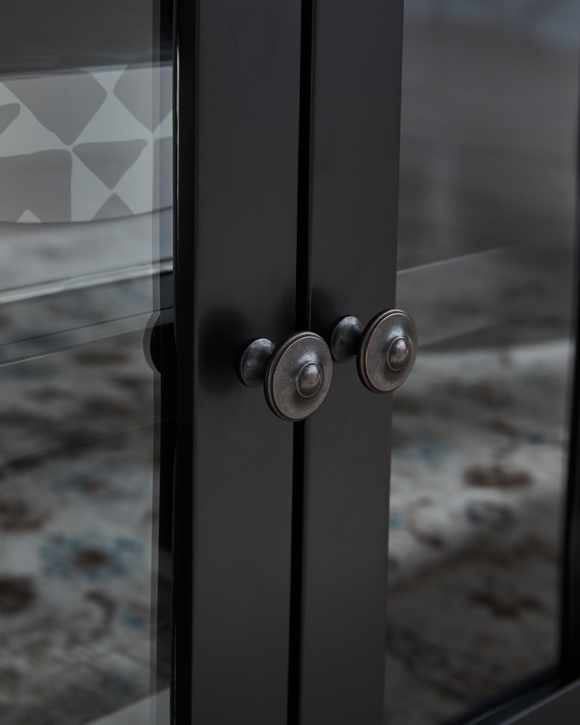 Raise the bar on modern farmhouse style with this TV stand with electric fireplace. Its sturdy silhouette and casual good looks are accentuated with a two-tone finish, which pairs a warm satin black base with a contrasting butcher block veneer top. Glass door cabinets with adjustable shelves offer plenty of storage for media and electronics. What really turns up the heat: an electric infrared fireplace insert with faux firebrick surround that operates with or without infrared heat. With the touch of a button, adjust the temperature and the flame brightness, and set the timer for long-lasting enjoyment.