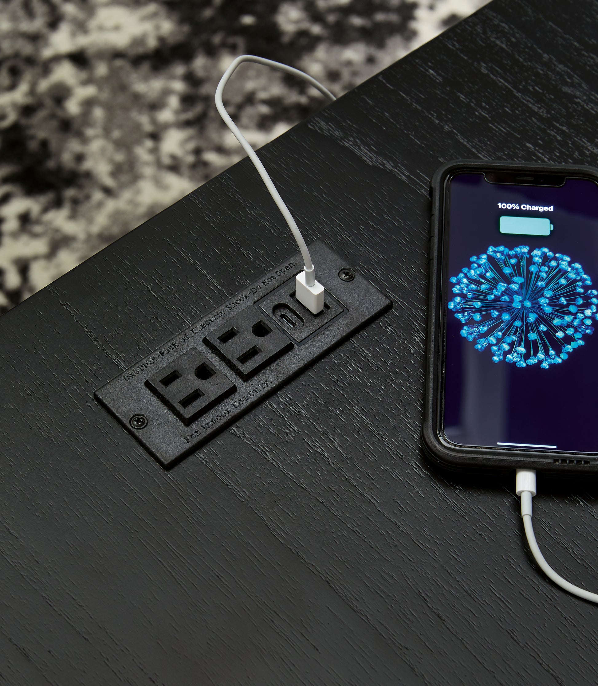 If you are a lover of simplicity, this end table is the perfect choice. Its black finish, casual contemporary design and spacious storage capacity provide functional style wherever it’s displayed. And with conveniently located USB charging ports, this table keeps up with your high-tech lifestyle.